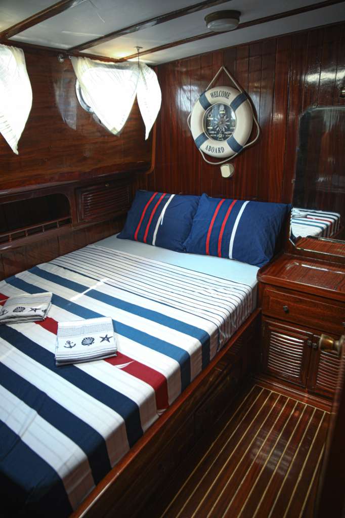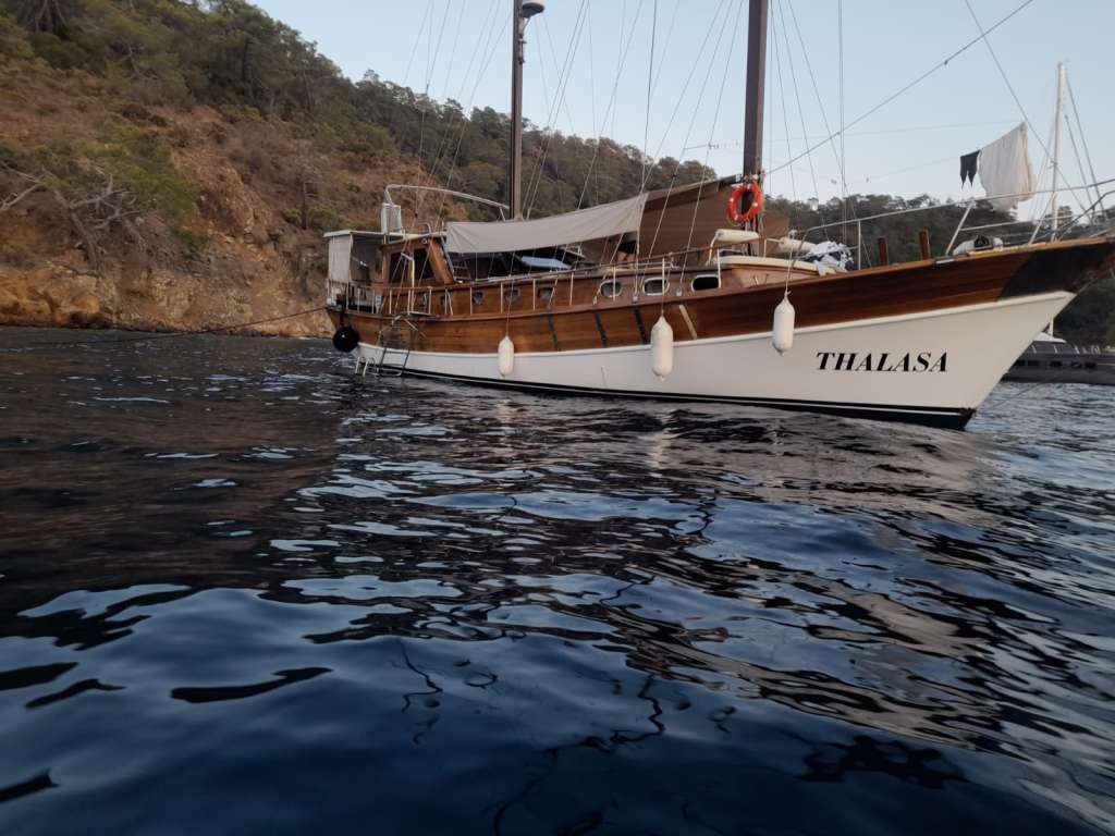 Thalassa, 18.10 meters long and 5.90 meters wide, is berthed in the port of Fethiye. Built in 2007 and renovated in 2007, she has two cabins: one master and one double.