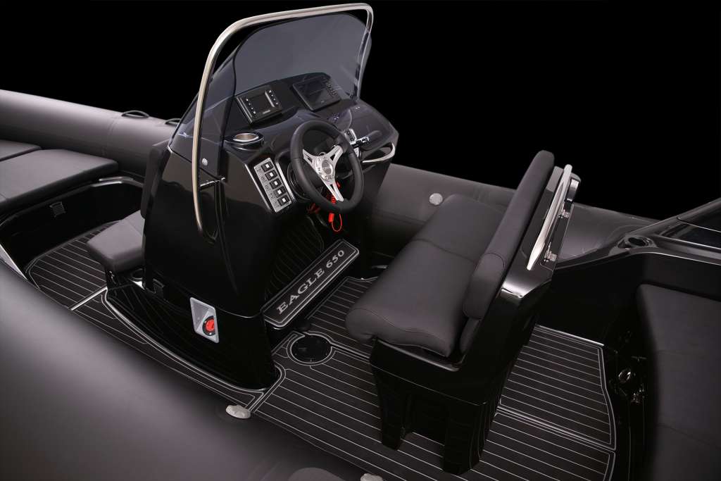 The Eagle 6.7, the successor to the best-selling E650, is a rigid inflatable boat suitable for the whole family. At 6.7 meters long and 2.50 meters wide, this spacious boat invites you to cruises and day trips on large inland lakes or the seashore. There’s ample space for eight passengers in the padded double, front and rear seats, as well as the sunbathing area in the bow – up to 13 passengers can be safely carried on board. All seats have ample storage for clothing, bathrooms, and meals. A folding table is the centerpiece of shared dining on board.