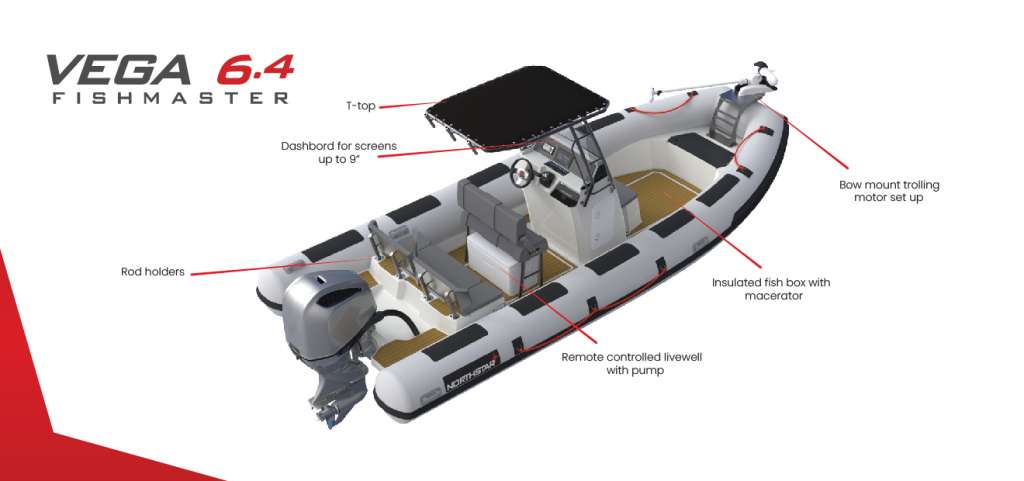 With its extra-wide deck and functional seating area, the Vega 6.4 is your ideal sports/multi-purpose RIB.