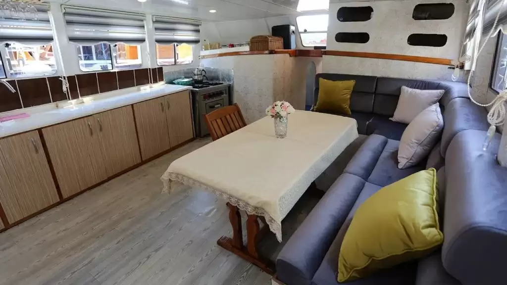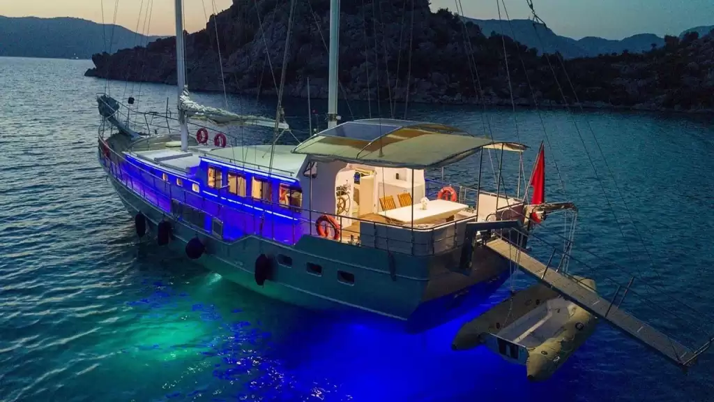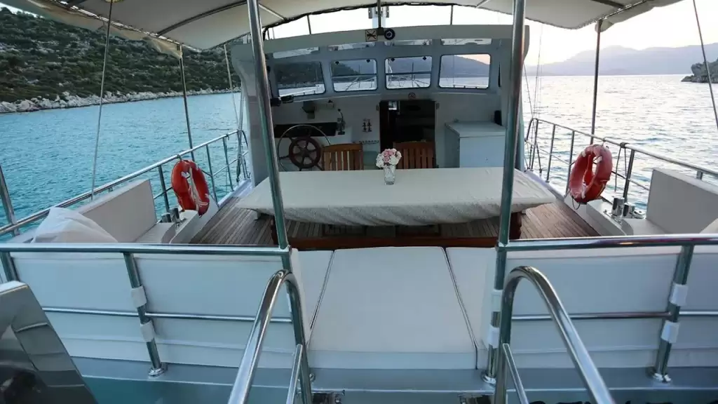 NotlarCumartesi 14:00 giriş , bir sonraki Cumartesi 09:30 çıkış yapılır. Tam boy 19 metre ve eni 5 metredir. Teknemizde 1 adet kaptan,1 adet aşçı ve 1 gemici olmak üzere 3 personel bulunmaktadır. Guletimizde  düşük sezon aylarında ise minimum 3 gece ve üzeri kiralama yapabiliyorsunuz