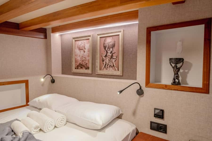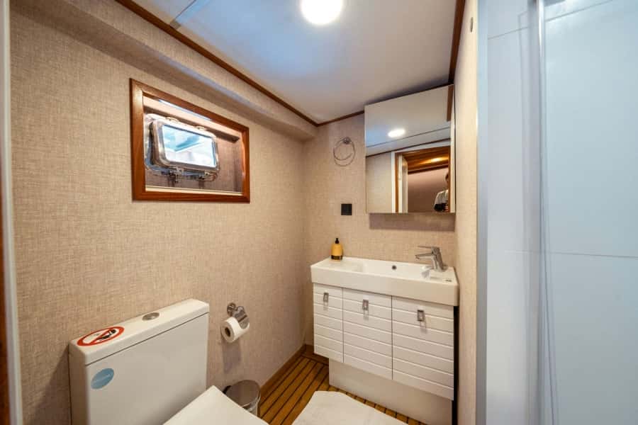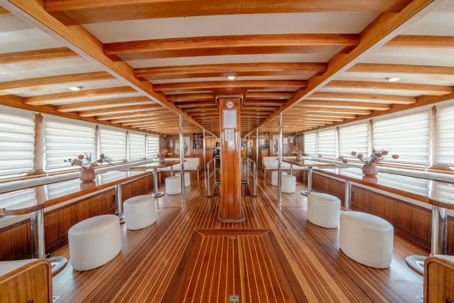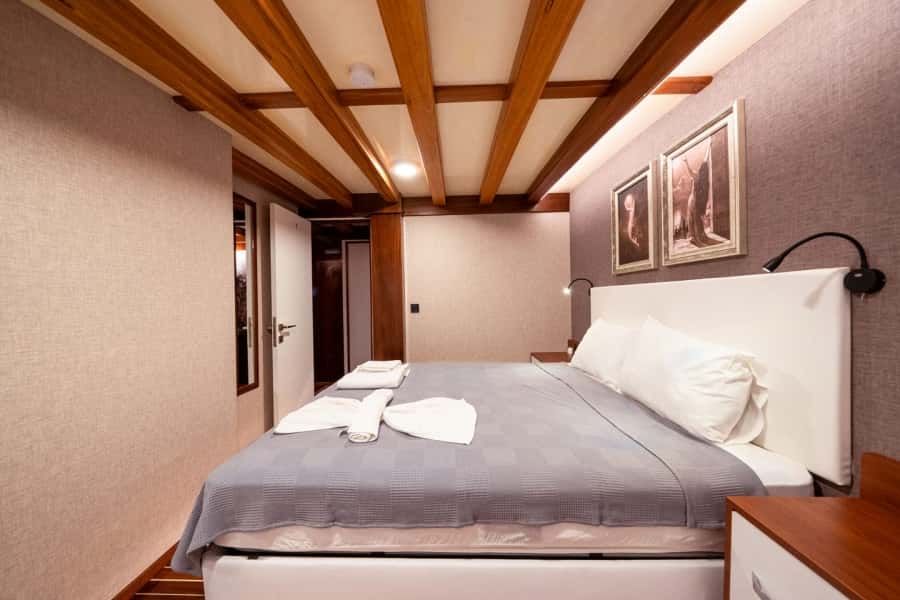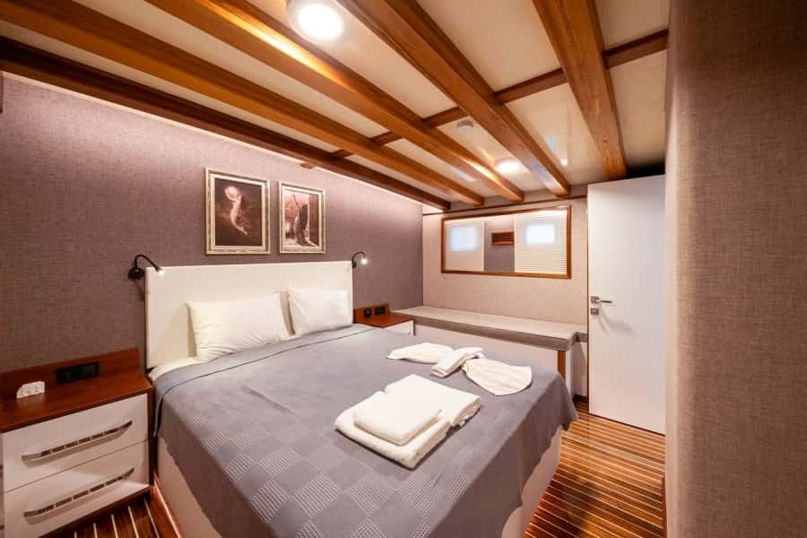43 metre uzunluğunda ve 16 kabinli geniş ve lüks guletimiz, 36 misafire kadar konaklama imkânı sunarak özel yat kiralama deneyiminizi unutulmaz kılar. Büyük gruplar için ideal olan bu gulet, çift kişilik, ikiz ve üç kişilik kabinleri bir araya getirerek her misafire konforlu bir alan sağlar.