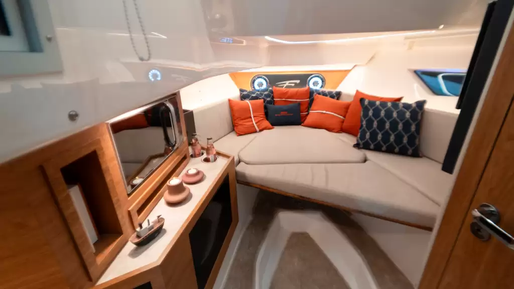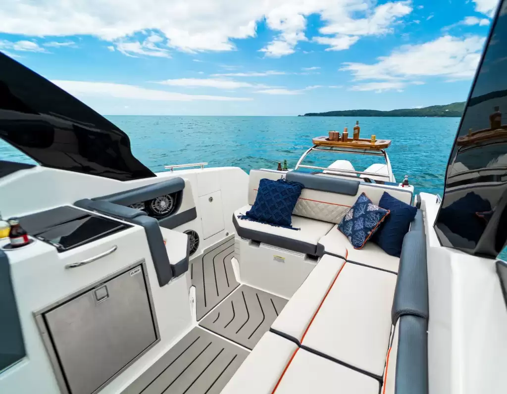 Yan şezlong, çıkarılabilir orta masa ve soğutucu, buzdolabı ve lavabo ile donatılmış kokpit barı ile tam etkileşim için planlanmış bir ortam, gemideki gününüzün olağanüstü unutulmaz olmasını sağlar.