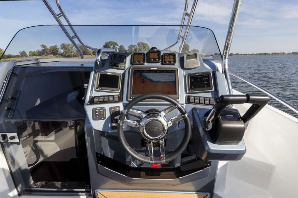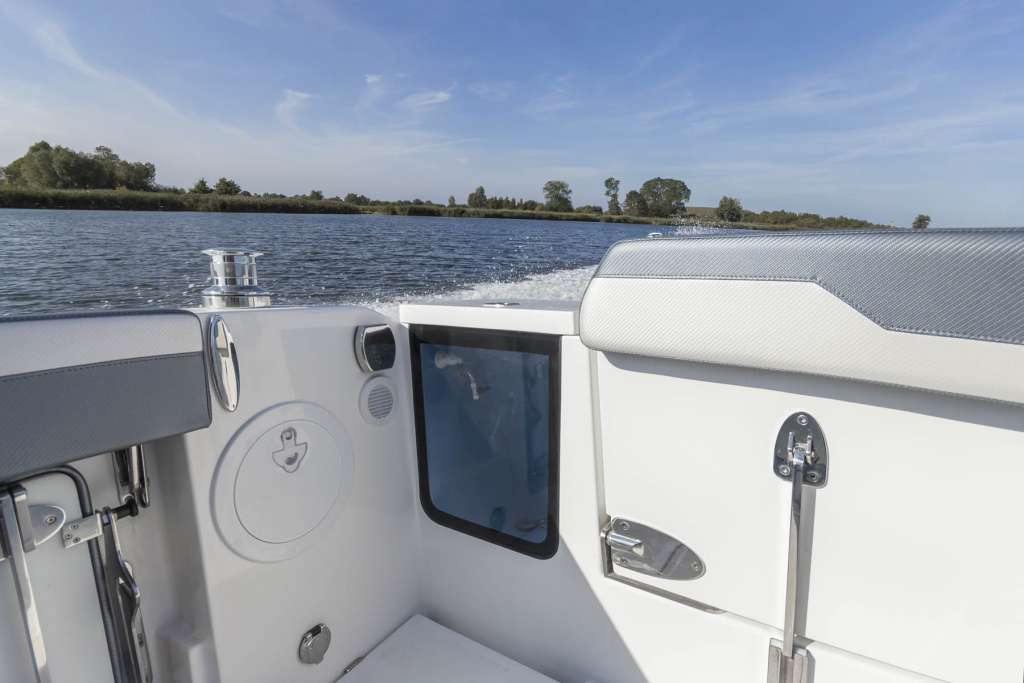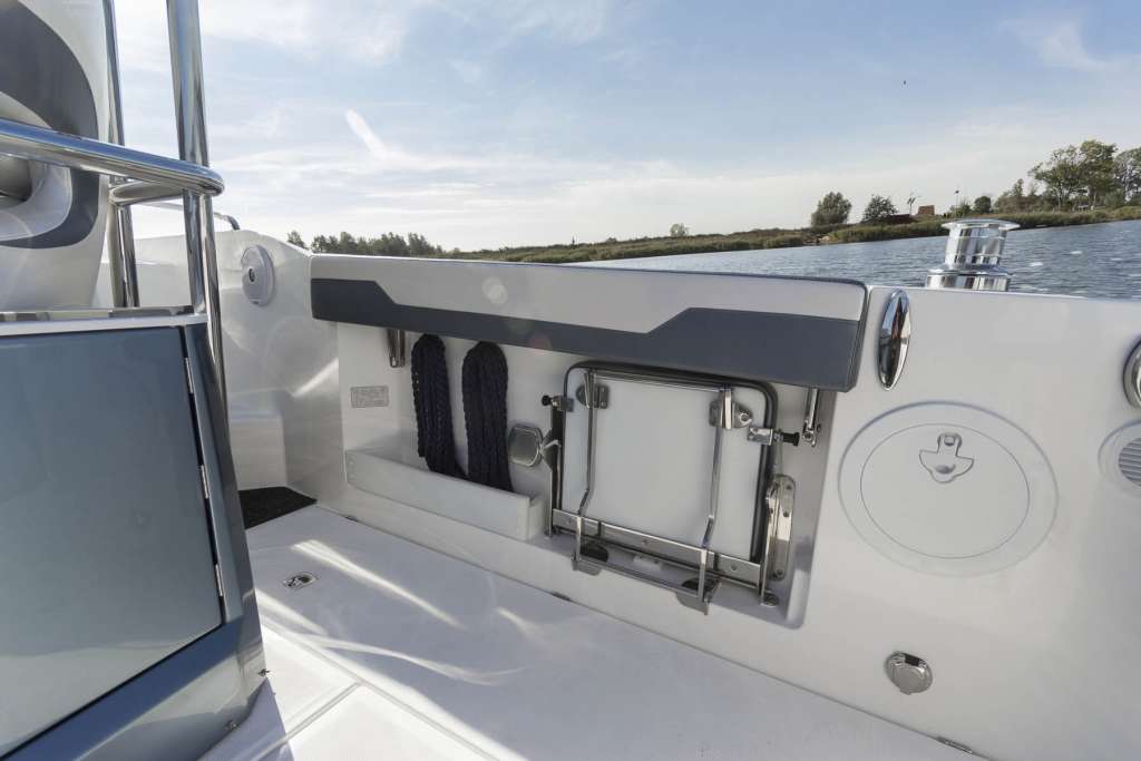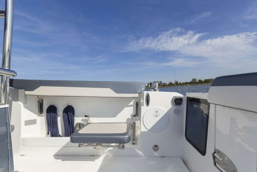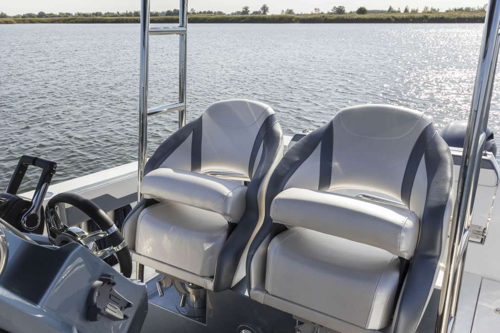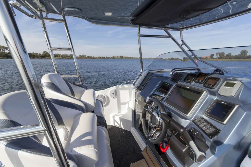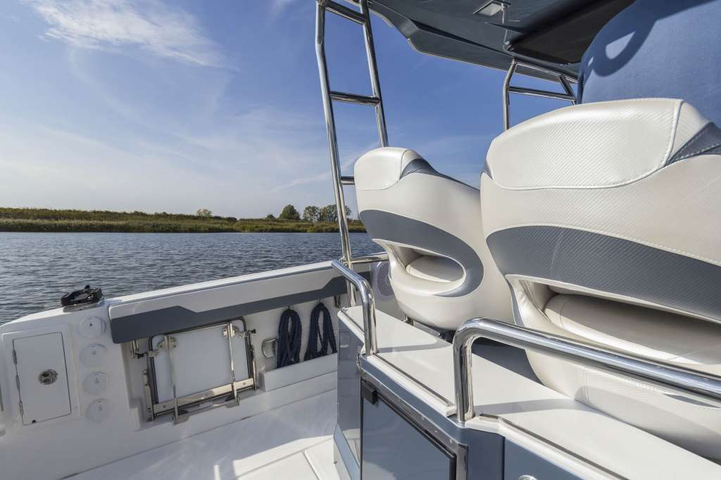 İki spor koltuklu dümen istasyonu mükemmel görüş alanı sunarken, isteğe bağlı ızgara uzun yolculuklarda kullanışlı olacaktır. Alanın altında büyük bir yemek odası, mutfak, sıhhi tesisat sistemli banyo ve ekstra bir yatak bulunmaktadır. Ek donanımlar arasında sert tavanlı bimini, balık kutusu ve çift motor kurulumu bulunur.