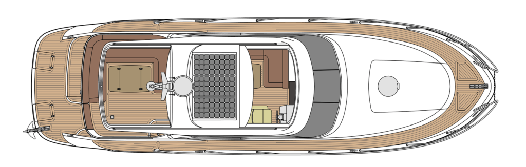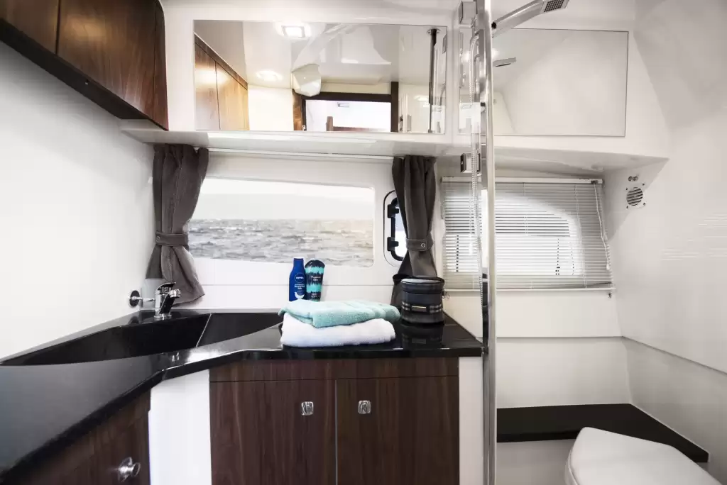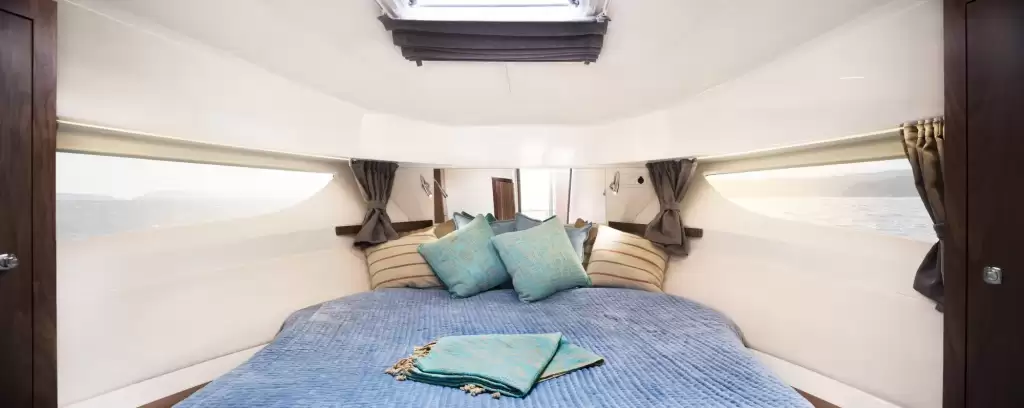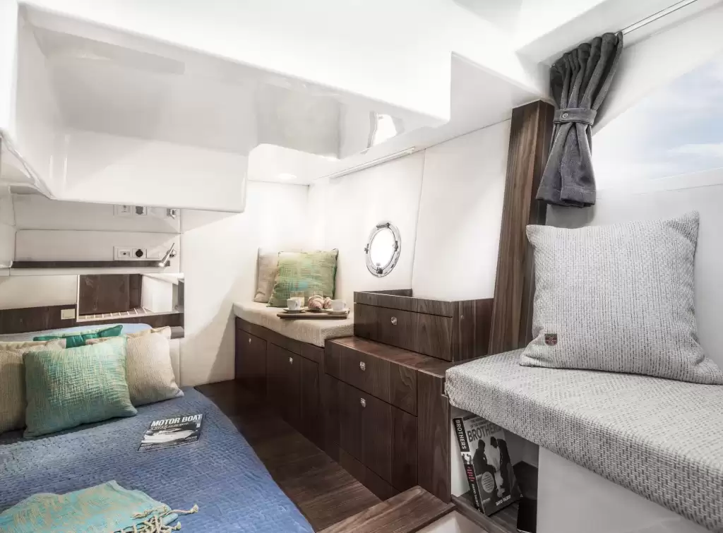 Geniş ön veya orta güverte kabinindeki ekstra kanepe ile konfor, misafirlerin alt güvertede rahatlamasını sağlar. Her iki kabinde de çift kişilik yatak, gardıroplar ve büyük depolama alanları ile sevdiklerinizle geçirdiğiniz zaman unutulmaz olacak. Banklı ayrı duş, 375’in ev hissiyatını da artırır.