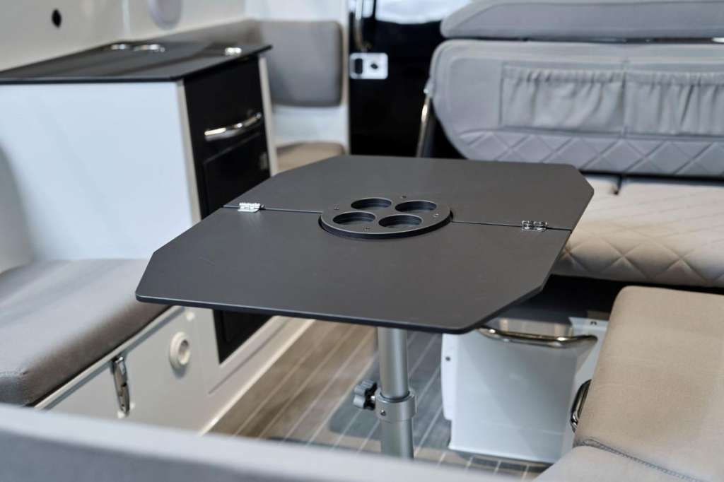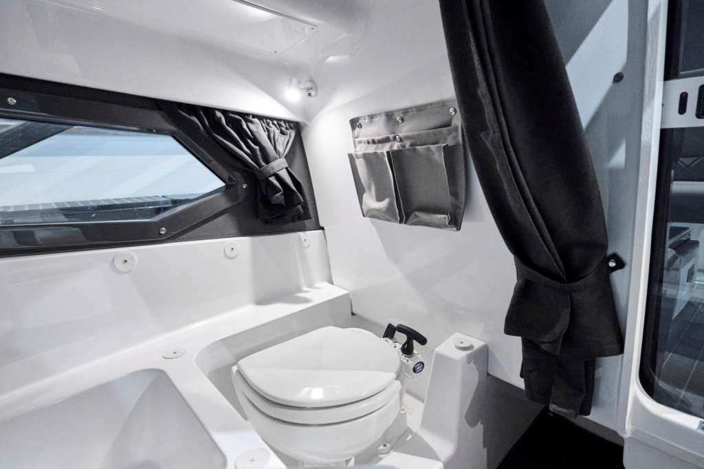 Yamarin 67 DC’deki Comfort Edition, kıç brandası, sol tarafta silecek, trim tırnakları, septik tanklı su tuvaleti ve bir masa içerir.